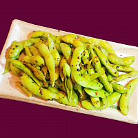 Spicy edamame with chilli oil on top.